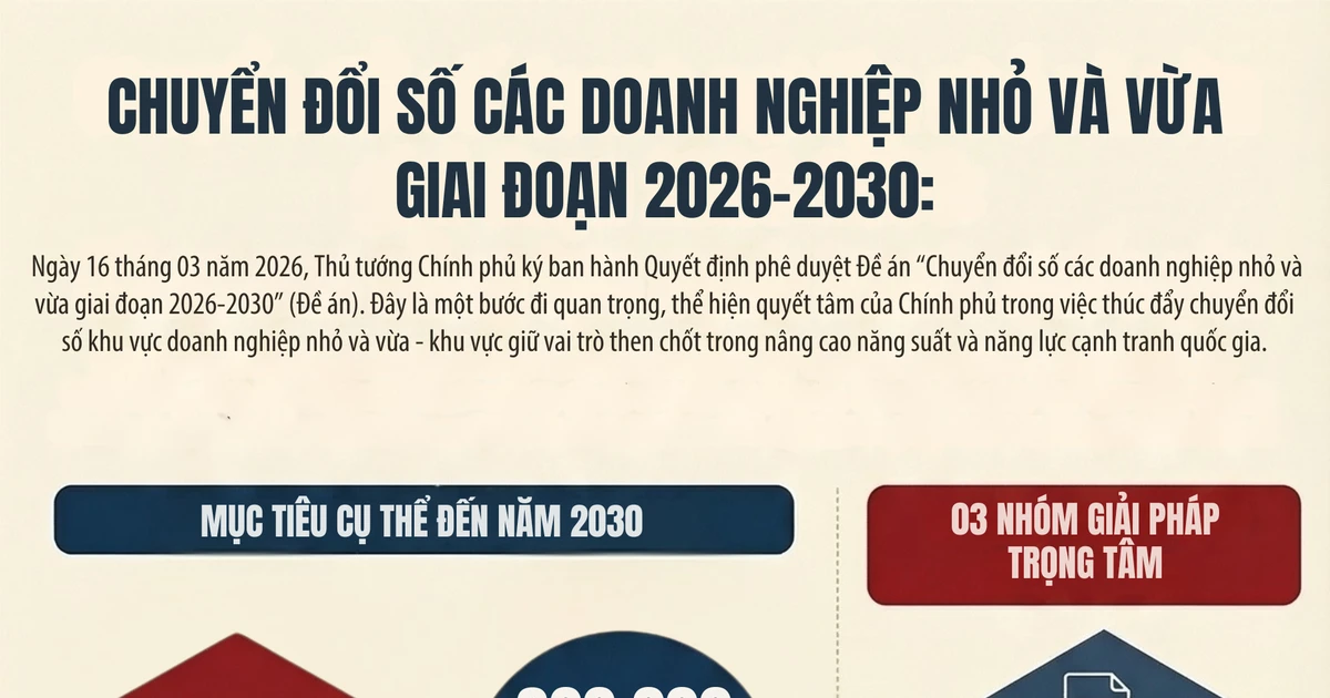 Theo Đề án chuyển đổi số các doanh nghiệp nhỏ và vừa giai đoạn 2026-2030 (433), ban hành ngày 16/3, Chính phủ xác định chuyển đổi số là giải pháp nhằm nâng cao năng suất, hiệu quả và lợi thế cạnh tranh của doanh nghiệp nhỏ và vừa. Chính phủ đặt mục tiêu, đến năm 2030, 500.000 doanh nghiệp thuộc diện